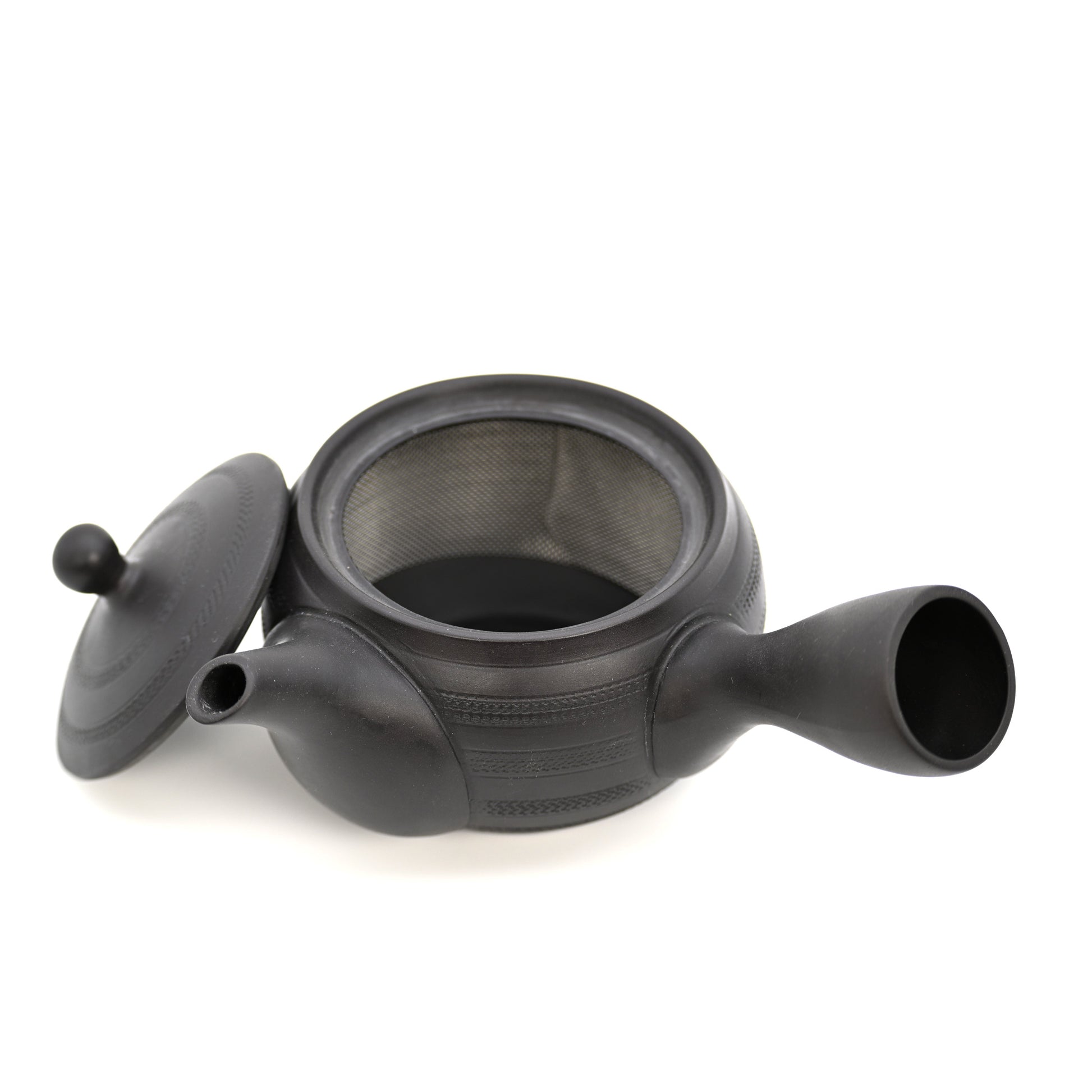This handcrafted kyūsu teapot features a unique belt-like ceramic mesh strainer stretched along the inner wall of the vessel. With a wider surface area than conventional strainers, the design allows tea leaves to infuse evenly, preventing clumping and supporting a smoother, more balanced brew. It is designed for everyday use, well suited for sencha, hojicha, and other loose-leaf teas.